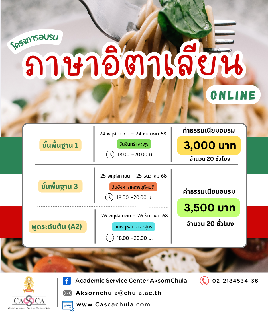 ภาษาอิตาเลียน ขั้นพื้นฐาน 1 (ออนไลน์) ทุกวันจันทร์และพุธ